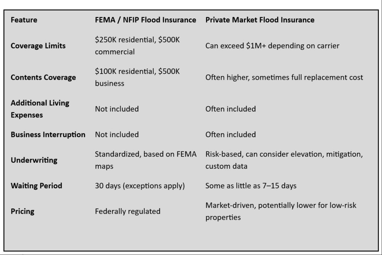 Private flood insurance is written by independent carriers, not FEMA. These insurers evaluate risk differently and can often provide broader coverage.